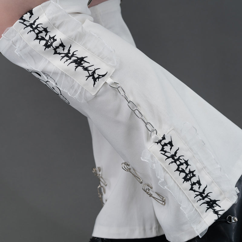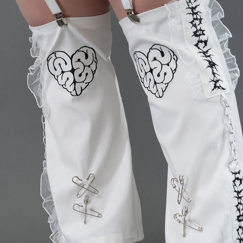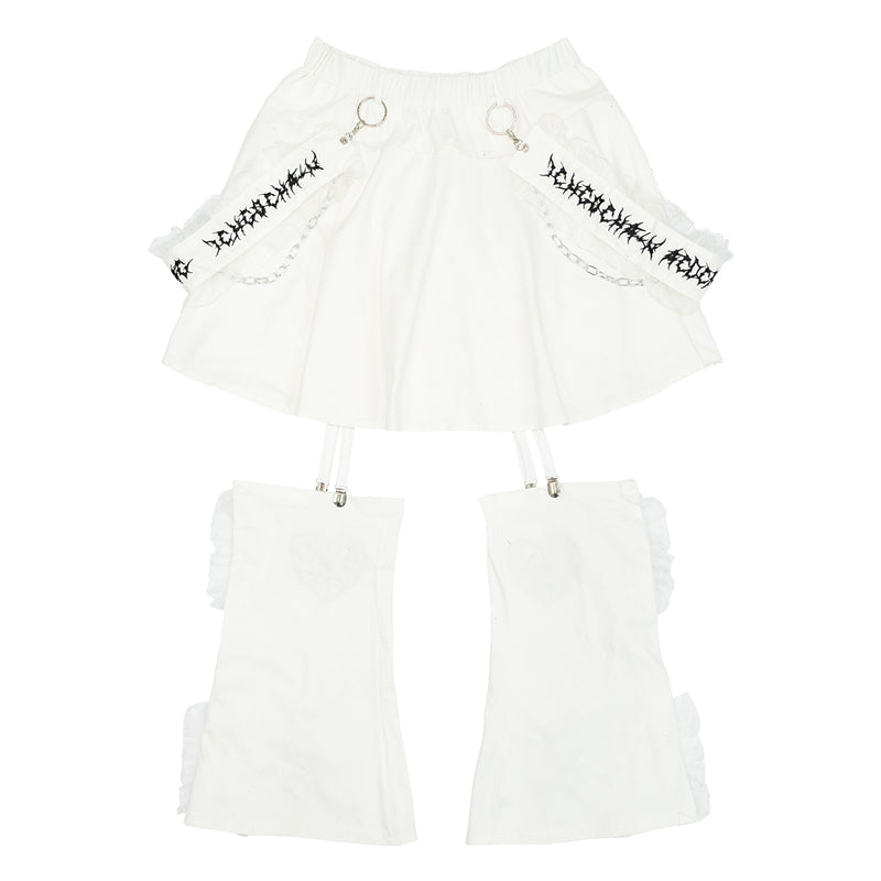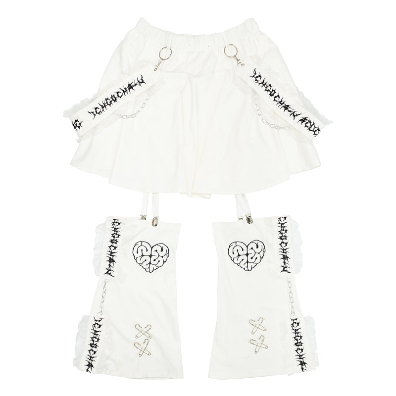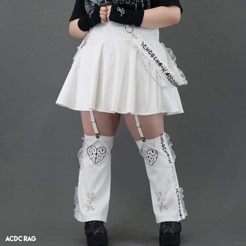 Short skirt that features attached leg warmers with bold details is perfect for those who love the “guro kawaii” vibe.