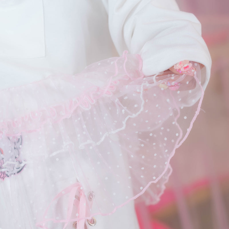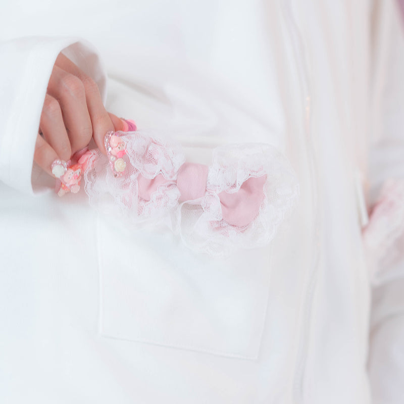 A hoodie with tons of lace and bunny ears! It features Hanyo Usagi embroidery on the chest and a cute charm on the zipper pull. The ribbons on the front pockets are detachable. With its oversized fit, anyone can wear it regardless of gender or body type.