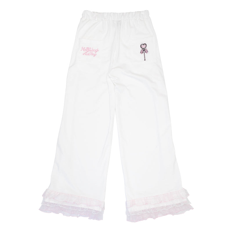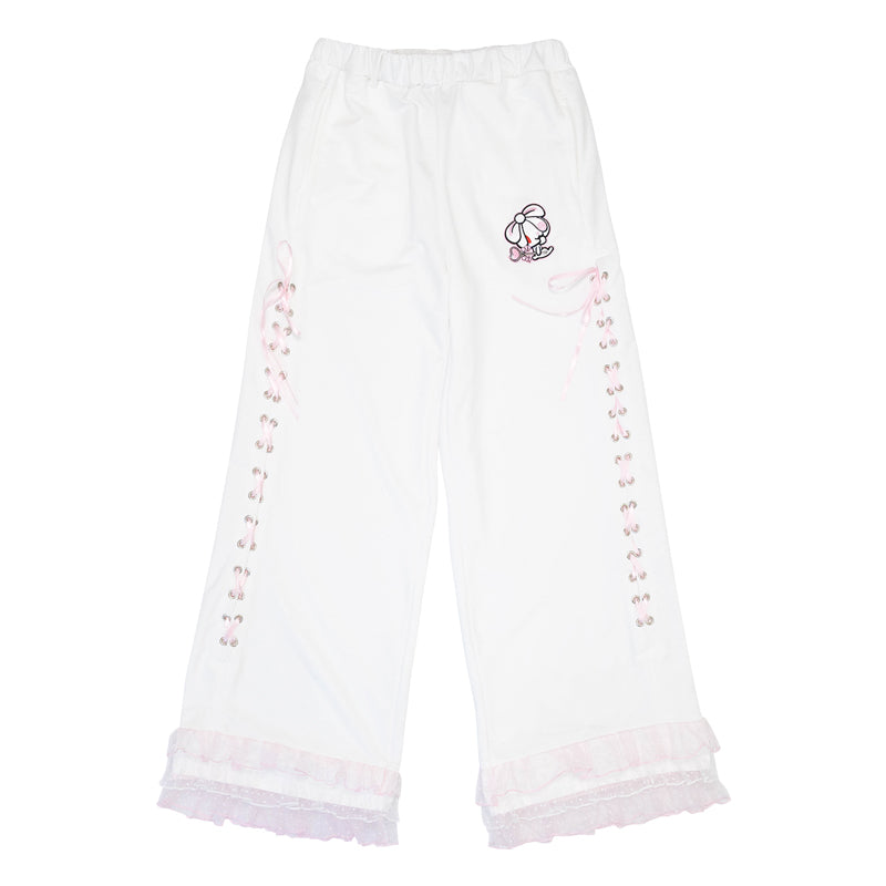 These long pants have lace trim on the sides for a nice touch. They’re super comfortable with a relaxed fit and an elastic waistband, so they’re easy to wear all day.