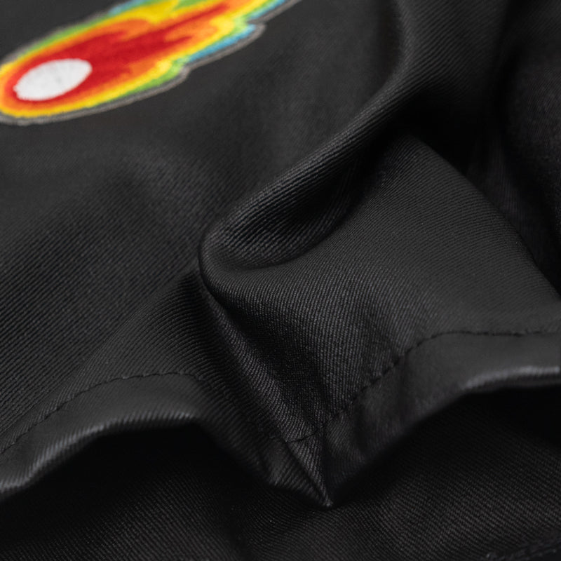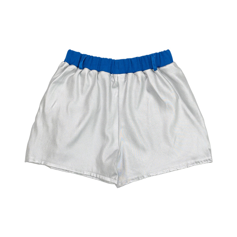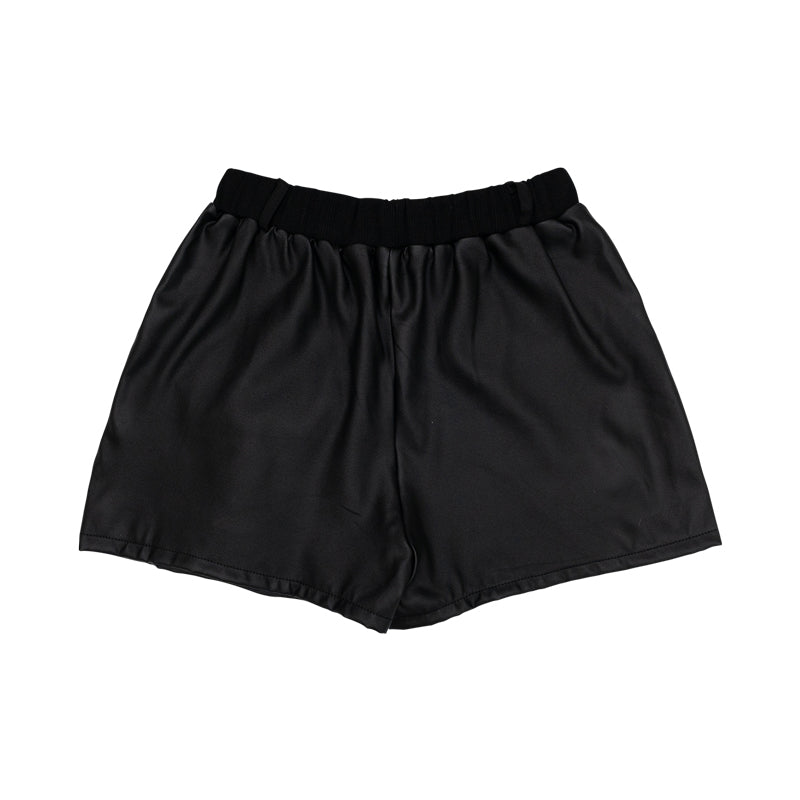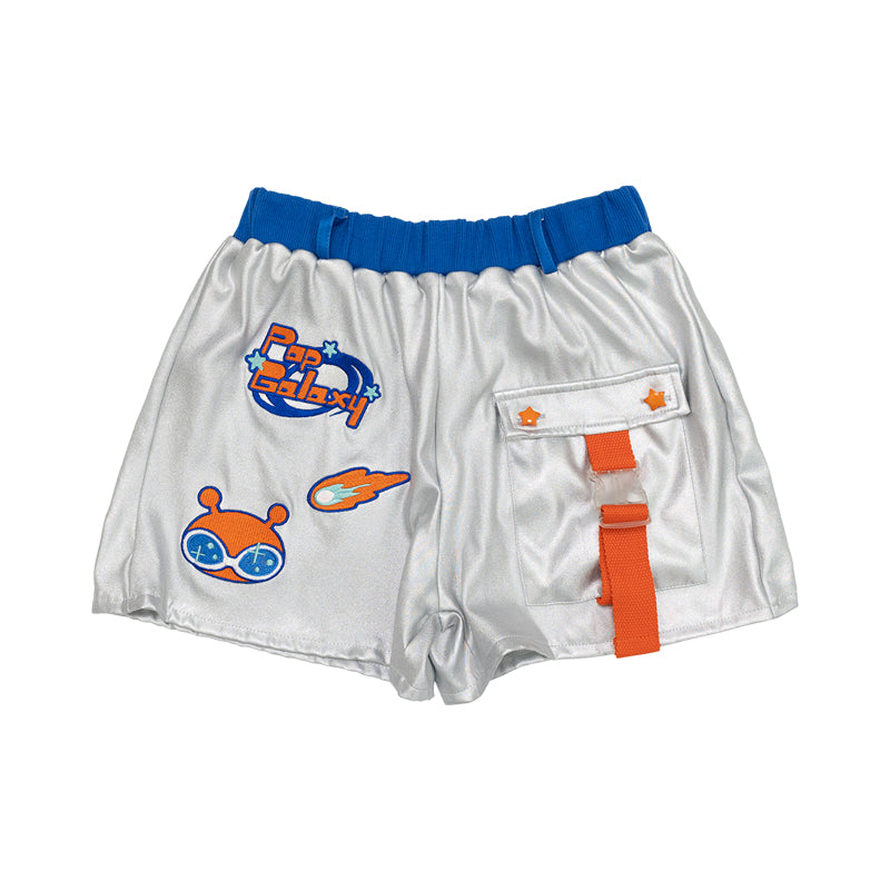 【ディテール】 ツヤ感素材のショートパンツ! 各部のポケットや刺繍デザインがキュート◎ ジャケットとのセットアップがおすすめです♪ ※高温に弱い素材ですのでアイロンや乾燥機のご使用はお控えください。