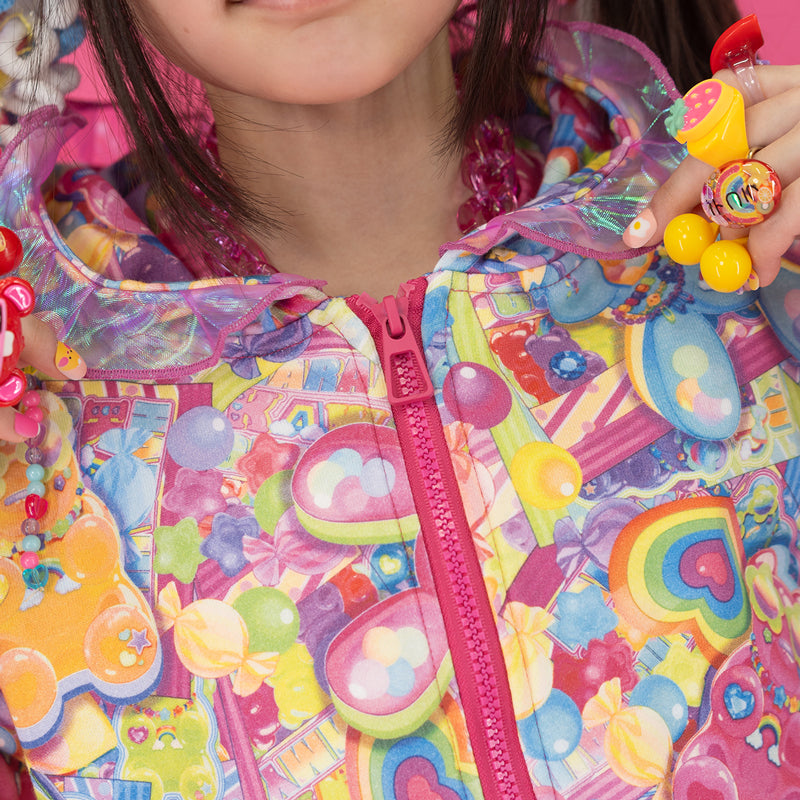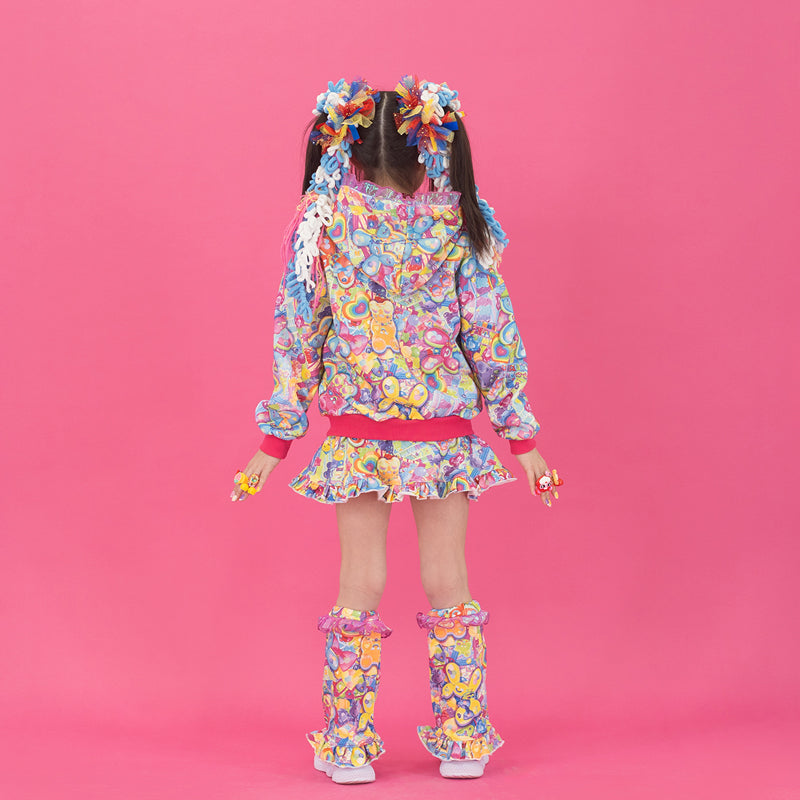 【ディテール】デザインはそのままにキッズサイズにしたパーカーです!カラフルキュートな総柄にオーロラフリルの合せ技♪コットン100%で着心地にもこだわりました◎