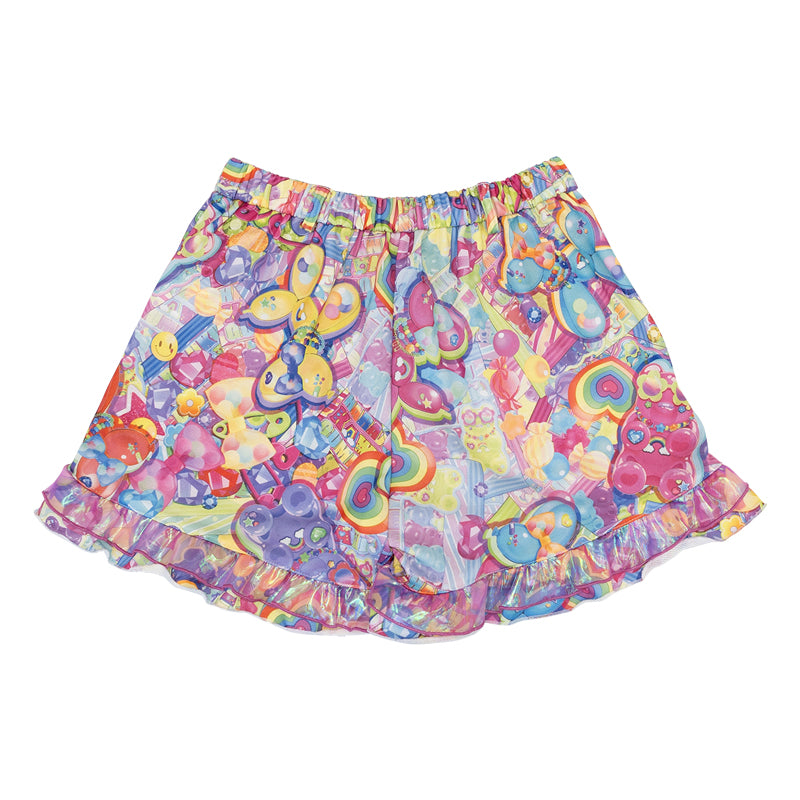 【ディテール】カラフルキュートな総柄ショーパン♪キラキラ素材のオーロラフリルがポイントです!ウエストゴムなのでフィット感抜群◎