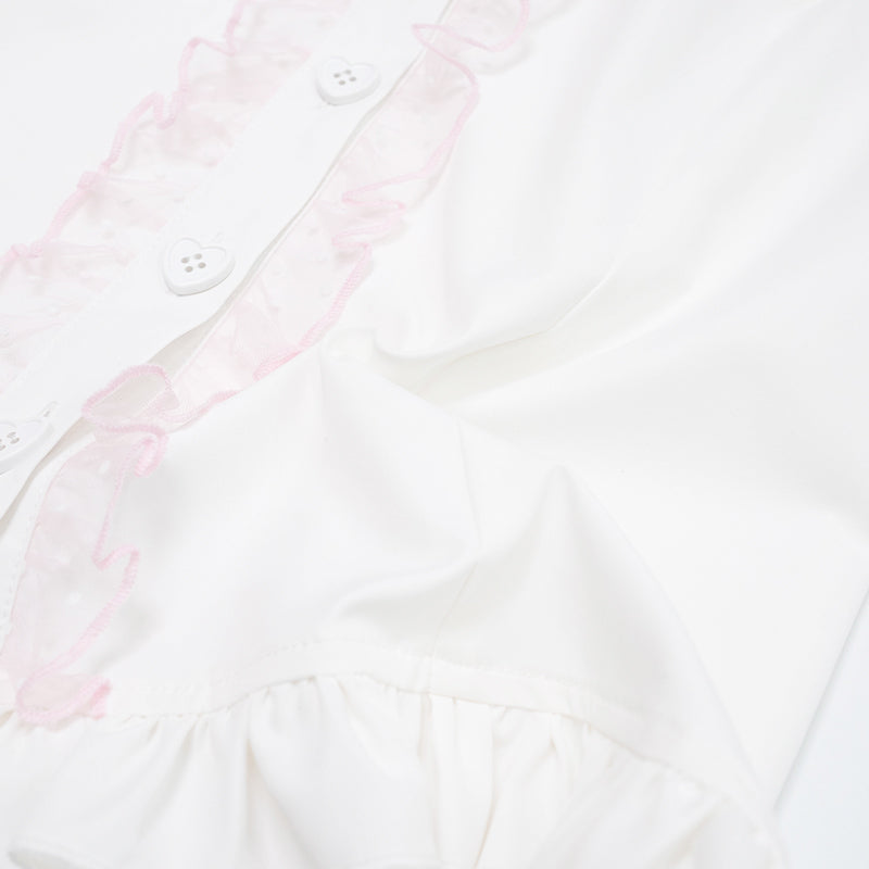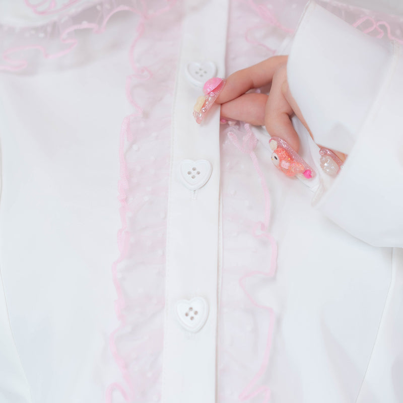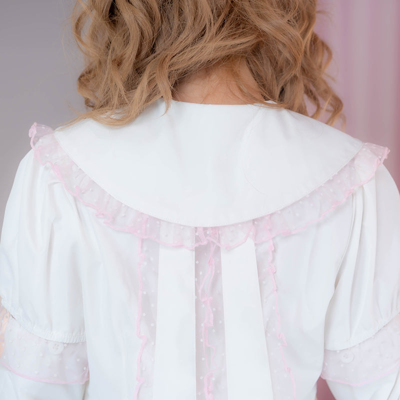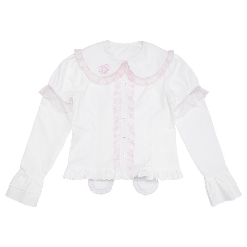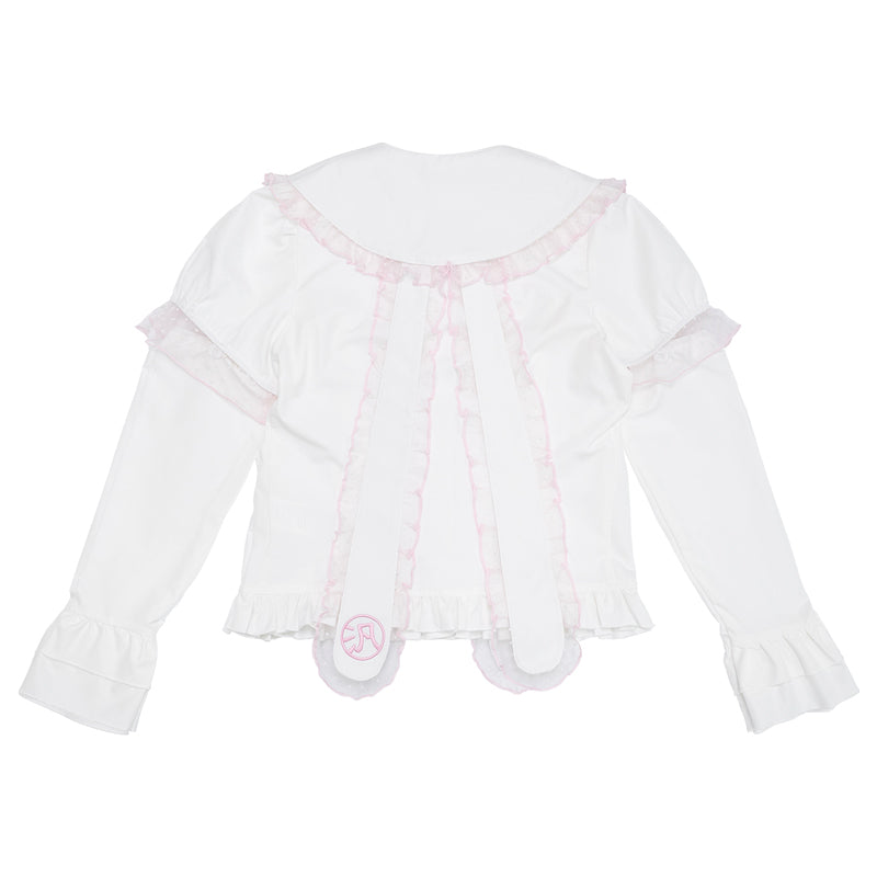 【ディテール】各部にレースを配置したキュートなブラウス!襟の刺繍やハートのボタンなど細部にこだわりあり♪袖は外して使える2way仕様、襟のうさみみもボタンで取り外せます◎